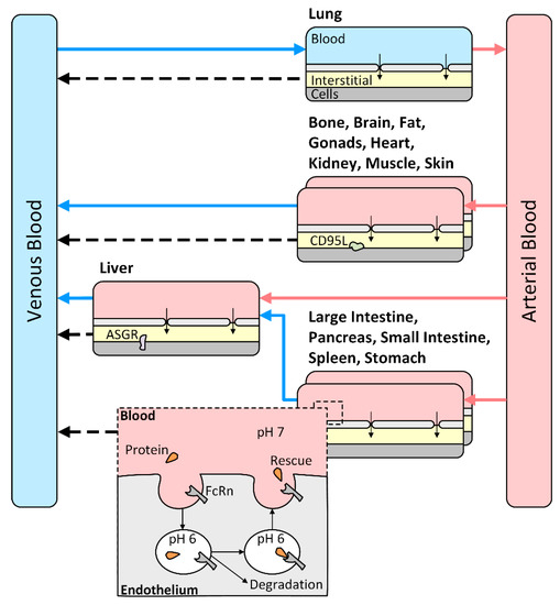 - Niederalt, C.; Kuepfer, L.; Solodenko, J.; Eissing, T.; Siegmund, H.-U.; Block, M.; Willmann, S.; Lippert, J. A generic whole body physiologically based pharmacokinetic model for therapeutic proteins in PK-Sim. J. Pharmacokinet. Pharmacodyn. 2018. [Google Scholar] [CrossRef]