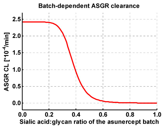 with ASGR CL = clearance of asunercept by ASGR, ASGR CLspec = maximum ASGR CL for batches with a sialic acid:glycan ratio of zero.