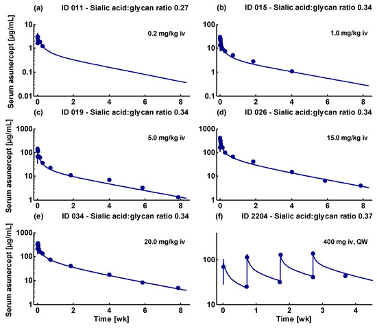 Model performance for intravenous administration of 0.2 mg/kg to 20.0 mg/kg asunercept. Individual simulations are shown as lines, measured asunercept serum concentrations are shown as dots. All presented serum concentration-time profiles are from the training dataset. (a–e) Asunercept serum concentrations of healthy male volunteers that participated in the Phase I study APG101_CD_001; (f) asunercept serum profile of a female glioblastoma patient enrolled in the Phase II study APG101_CD_002. Predicted compared to observed asunercept serum concentration-time profiles of all 51 analyzed individuals are shown in Supplementary Figures S1–S3.