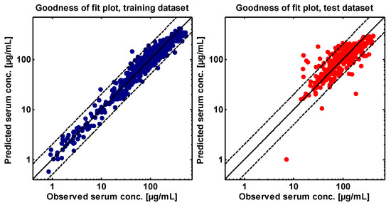 Asunercept goodness of fit plots illustrating the model performance for the training dataset (blue) and the test dataset (red). Shown are predicted compared to observed values of all measured asunercept serum concentrations included in this analysis. The solid lines represent the line of identity; the dashed lines indicate twofold deviation.