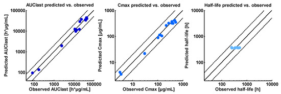 The study design of the Phase I study included PK sampling, allowing for the calculation of PK parameters. Plots showing the correlation of predicted compared to observed AUClast, Cmax and half-life values of this clinical trial are presented in Figure 5, covering the whole clinically investigated dosing range. The plotted values are listed in Table 3.