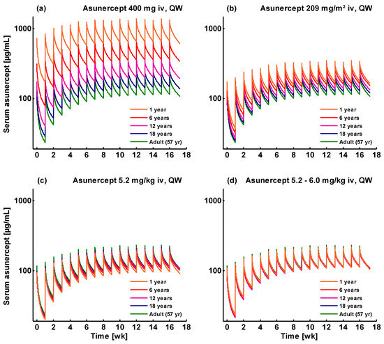 Simulated asunercept serum concentration-time profiles using different dosing approaches in pediatric patients. (a) Weekly infusion of a fixed dose of 400 mg; (b) weekly infusion of a body surface area normalized dose of 209 mg/m2; (c) weekly infusion of a body weight normalized dose of 5.2 mg/kg; (d) weekly infusion of the recommended doses (see Table 4). Orange: 1-year old patient; red: 6-year old patient; purple: 12-year old patient; blue: 18-year old patient; green: adult Phase II study reference patient. Simulations were conducted using a sialic acid:glycan ratio of 0.64 for asunercept.