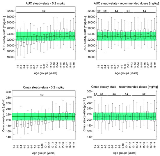 However, using the body weight-based approach, population simulations of 5.2 mg/kg asunercept QW predict lower serum concentrations and lower median AUC and Cmax values for children <12 years than observed in the adult reference population (see Figure 6c and Figure 7, left panel). As no adverse events were reported in the Phase I dose escalation study, all doses up to 20.0 mg/kg are considered safe and well tolerated in healthy volunteers. Therefore, the recommended doses for patients <12 years were increased until the population medians of the predicted AUCs at steady-state were the same or slightly higher than the AUC of the Phase II adult reference population. Population predicted steady-state AUC and Cmax values using the recommended doses are presented in Figure 7 (right panel) and the final dose recommendations are listed in Table 4. Population predicted AUC and Cmax values for the first doses, following administration of 5.2 mg/kg asunercept QW or of the recommended doses, are presented in Supplementary Figure S6.