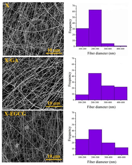 Figure 1. Morphological analysis by scanning electron microscopy (SEM) and average fiber diameter distributions of electrospun (upper) X nanofibers, (middle) X-GA, and (lower) X-EGCG nanofibers.