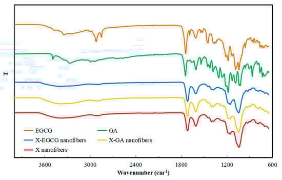 Figure 2. FTIR spectra of electrospun X, X-GA, X-EGCG nanofibers, GA, and EGCG.