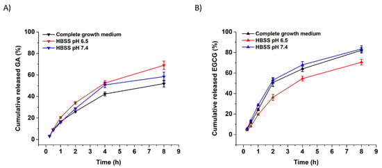Figure 3. Cumulative in vitro release of GA (A) and EGCG (B) from xanthan nanofibers. All data were the mean ± SD of three independent experiments.