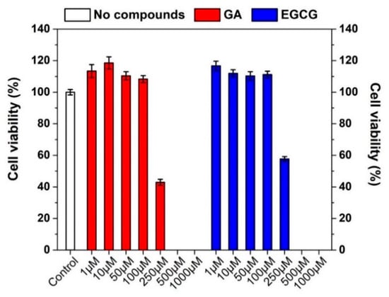 The viability of Caco-2 cells after 24 h treatment with free GA, EGCG, and PBS as the control was evaluated through MTS bioassay (Figure 4).