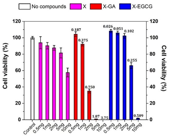 Figure 5. MTS viability bioassay of Caco-2 cells after 24 h incubation with complete growth medium (control, white bar) and increasing amounts of empty xanthan nanofibers (X, magenta bars), gallic acid-loaded xanthan nanofibers (X-GA, red bars), and (−)-epigallocatechin gallate-loaded xanthan nanofibers (X-EGCG, blue bars). The numbers reported on top of the red and blue bars represent the maximum releasable concentration (mM) of GA and EGCG in a 1.2 mL volume of complete growth medium. Data were the mean ± SD of four independent experiments.