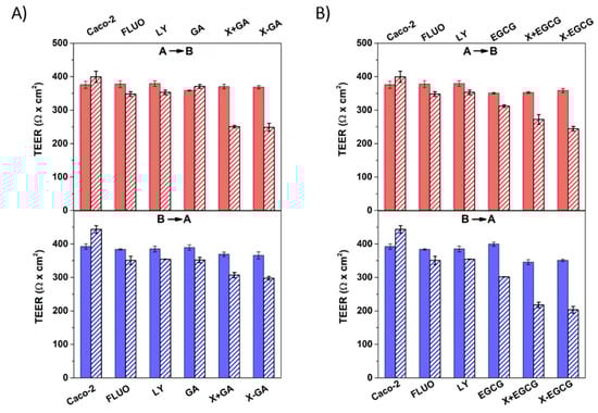 Figure 6. Transepithelial electrical resistance (TEER) measurements of cell monolayers before (full colored bars) and after (patterned bars) apical-to-basolateral (AB) and basolateral-to-apical (BA) studies for a time interval of 8 h. TEER values were recorded for GA, X + GA, and X-GA (A) and EGCG, X + EGCG, and X-EGCG (B). All data were the mean ± SD of three independent experiments.