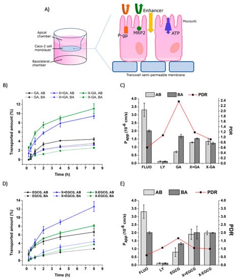 Figure 7. Transepithelial transport of GA and EGCG across Caco-2 monolayers. Illustration of the efflux transporters expressed on the apical membrane of epithelial cells (A). Transported amount of GA, X + GA, and X-GA (B), and EGCG, X + EGCG, and X-EGCG (D) in both AB and BA directions. Apparent permeability coefficient, Papp, and PDR of GA, X + GA and X-GA (C), and EGCG, X + EGCG, and X-EGCG (E). All data were the mean ± SD of three independent experiments.