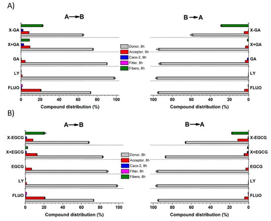 The fate of GA and EGCG during 8 h transepithelial transport in both AB and BA directions, was monitored by quantifying their concentration in the donor and acceptor compartments, in the cell lysate, insert membrane (filter), and within xanthan nanofibers (adsorbed or unreleased). Figure 8 shows the distribution of the tested compounds in the above-mentioned compartments. After 8 h experiment, most of the incubated compounds were still found in the donor chamber (≥60% of the concentration at time = 0 h), and only less than 20% were detected in the acceptor side. However, the yields of GA and EGCG recorded in A were higher when incubated with xanthan nanofibers than in its absence. Small amounts of GA and EGCG were also detected inside the epithelial monolayers (3% and 1.3%, respectively), and adsorbed to or unreleased from xanthan nanofibers (29% and 21%, respectively).