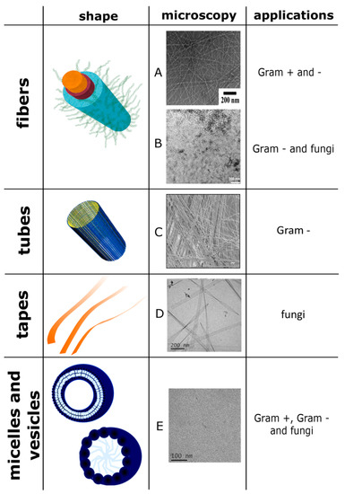 Some of the structures with antimicrobial properties mentioned in the article and their respective shapes assumed after the self-aggregation and their applications on pathogens. The image A is reprinted (adapted) with permission from reference [92]. Copyright 2014 American Chemical Society. The image B and the image of the fiber are reprinted (adapted) with permission from reference [111], scale bar is 200 nm. Copyright 2019 American Chemical Society. The image C is reprinted (adapted) from reference [94], scale bar is 10 μm. This article is licensed under a Creative Commons Attribution 4.0 International License http://creativecommons.org/licenses/by/4.0/. The images D and E are reproduced from reference [104]—Published by The Royal Society of Chemistry. The images of the tube are reprinted (adapted) with permission from reference [112] Copyright 2009 American Chemical Society. The images of micelle and vesicle are reproduced from reference [42] published in 2017 by The Royal Society of Chemistry.
