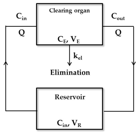In Figure 1, the perfusion model explains the relationship between Q and ER []. This model follows the well-stirred model that will be mentioned later. It assumes that the drug distribution in intra-cellular and extra-cellular fluids can instantaneously reach equilibrium, where the blood flow rate is rapid enough not to limit the distribution of a drug. If a drug is bolus administered into the reservoir, the mass balance equations are described by the following Equations (6) to (9).