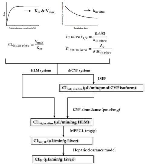 The purpose of IVIVE is to perform quantitative extrapolation of in vitro data to predict human parameters. A reliable extrapolation method to predict hepatic metabolic clearance utilizes in vitro kinetic data and mathematical equations []. The general approach of IVIVE using human liver microsomes (HLM) or recombinant human cytochrome P450 (CYP) system (rhCYP) is presented in Figure 2. Using these systems, metabolite production or substrate depletion are used to calculate the in vitro metabolic kinetic parameters (i.e., Km, Vmax, and kin vitro). The IVIVE method has been improved since its introduction by Rane et al. []. Scale-up of in vitro data to in vivo is performed by analyzing the correlation between in vitro and in vivo data or applying physiological correction factors. Many investigators have tried to improve the accuracy of prediction (Table 2).
