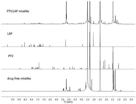 The effective incorporation of PTX and LAP into micelles was shown by means of NMR analysis. Figure 2 presents 1H NMR spectra of individual drugs, lyophilized drug-free micelles and lyophilized drug-loaded micelles. Signals arising from the methine (5.2 ppm) and methyl (1.5–1.4 ppm) protons of PLA and methylene protons of PEG (3.6 ppm) were observed in the drug-free micelles. In the spectrum of PTX/LAP-loaded micelles, signals arising from the drugs were detected in addition to all the signals of the copolymer. PTX was identified by proton resonances at 1.0 ppm assigned to its methyl groups at C16 and C17 and LAP by signals at 8.6 and 6.5 ppm belonging to the aromatic groups. As shown in Table 1, PTX displays higher loading capacity (2.47%) compared to LAP (1.62%). This finding can be explained by interactions between OH and NH groups of PTX with the C=O group of PLA [27,32]. Intermolecular interactions may facilitate better drug entrapment inside the micelles. Similar results were obtained with other multidrug micelles containing PTX (e.g., PTX and 17-N-allylamino-17-demethoxygeldanamycin) [27].