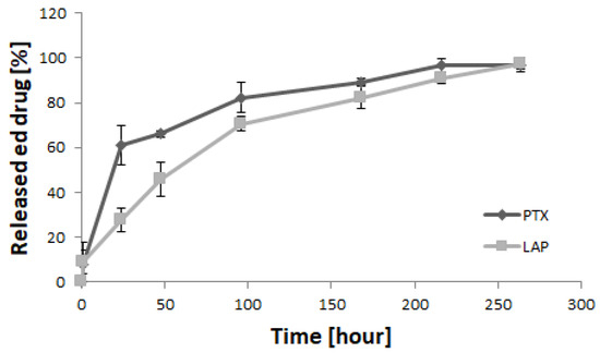 The release of drugs from the micellar system was studied under in vitro conditions (Figure 3). Similar amounts of both drugs were released from the micelles after 1 h (8.0% of PTX and 8.7% of LAP). However, PTX exhibited higher release after 24 h (61.2%) compared to LAP (27.6%). Beyond this, the release of PTX slowed down and was almost completed after 264 h (97%). Contrary to PTX, the release of LAP gradually increased to 45.9% after 48 h, 70.7% after 96 h and 97.5% after 264 h.