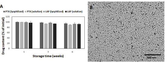 To determine the stability of the drug-loaded micelles, the drug content and morphology was analyzed (Figure 4). Lyophilized micelles retained both the initial drug content and morphology for at least 6 weeks. Thus, it was confirmed that the lyophilization process does not compromise micellar properties. Some changes in the morphology of the micelles stored in solution were observed, because spherical nanoparticles were the vast majority after 6 weeks (Figure 4B). The same effect caused by hydrolytic degradation was also observed for other bioresorbable polymers, e.g., poly(ε-caprolactone)-co-PEG [35]. The PTX and LAP contents in micellar solution decreased insignificantly to 93.4% and 93.5% after 3 weeks and to 89.5% and 92.4% after 6 weeks, respectively (Figure 4A). The data indicated great stability of the PTX/LAP-loaded micelles in both the lyophilized and solution forms.