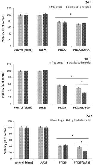 Cytotoxic effect of the PTX (25 nM) and LAP (25 nM) combination on MCF-7 breast cancer cells. MCF-7 cells were treated with PTX-, LAP- and PTX/LAP-loaded micelles, and the mixture of free drugs for 24 h, 48 h or 72 h and then cell viability was determined by sulforhodamine B assay and expressed as a percentage of the control (mean ± SD, n =4). * p < 0.05 vs. control; PTX/LAP-loaded micelles vs. free PTX/LAP.