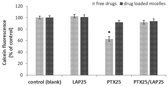 Effect of the PTX (25 nM) and LAP (25 nM) combination on P-gp activity in MCF-7 breast cancer cells. MCF-7 cells were treated with PTX-, LAP- or PTX/LAP-loaded micelles, and the mixture of free drugs for 1 h and then calcein-AM assay was performed. Calcein fluorescence was expressed as a percentage of the control (mean ± SD, n = 4). * p < 0.05 vs. control.