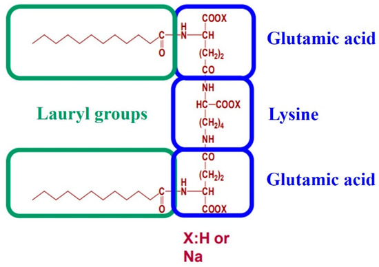 The chemical structure of a gemini surfactant, SLG-30. The hydrophilic moiety of this surfactant has two derivatives of amino acid, i.e., two glutamic acid moieties, linked through a lysine spacer, while the hydrophobic moieties are lauric acid.