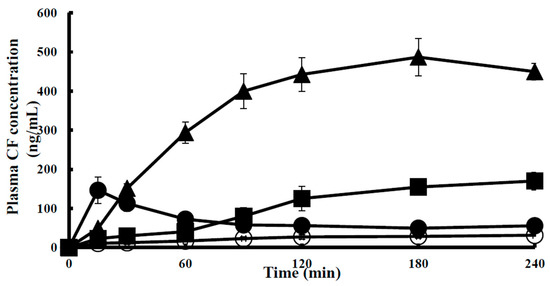 The enteric absorption of CF was examined by an in situ closed-loop method, as reported previously [22,24]. The experiments were carried out in accordance with the guidelines of the Animal Ethics Committee at Kyoto Pharmaceutical University. The protocols were approved by this Committee (permit number: 16-12-069, permit date: 14 April 2016). The rats were starved overnight for approx. 16 h pre-dosing, but water was freely available. After inducing anesthesia with sodium pentobarbital which was administered intraperitoneally at a dose of 32 mg/kg body weight, the rats were placed under a heat lamp to maintain a body temperature at around 37 °C, and the intestines were exposed using a midline-abdominal incision. After the bile duct was ligated, the intestines were washed with phosphate buffered saline (PBS, pH 7.4), and the remaining buffer solution was expelled with air. Enteric cannulation was performed at both ends using polyethylene tubing, and the distal parts of the small intestines were clipped by forceps. The dosing solutions (3 mL) with or without absorption enhancers kept at 37 °C, were directly introduced into the lumen of the enteric loop through a cannulated opening in the proximal part of the small enteric loop, which was then closed by clipping with another forceps. The jugular vein was exposed, and approx. 0.3 mL of blood was collected via a direct puncture into heparinized syringes at predetermined time intervals up to 240 min. The samples were immediately centrifuged at 12,000 rpm (15,000× g) for a period of 5 min to obtain the plasma fraction, which was stored on ice for further analysis. CF fluorescence signals in these plasma samples were detected after the treatment with the same volume of acetonitrile using a fluorescence spectrophotometer, Powerscan1 HT supplied by BioTek Instruments (Winooski, VT, USA) at an excitation wavelength of 485 nm and an emission wavelength of 535 nm. There was no significant background fluorescence in the plasma when the fluorescence intensities of CF were determined in this study. The peak drug concentrations (Cmax) and the time to reach the peak drug concentrations (Tmax) in the plasma were directly determined from the plasma concentration–time profiles. The area under the curve (AUC) was calculated by the trapezoidal method from pre-dose (time zero) till the administration of the final sample. The absorption enhancement ratios of CF, with or without absorption enhancers, were calculated as follows: