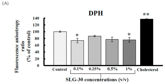 The BBMVs (100 μg protein) were incubated with 1 μM DPH, with 0.5 μM tma-DPH or with 5 μM DNS-Cl in HEPES-Tris buffer (25 mM HEPES, 5.4 mM KCl, 1.8 mM CaCl2, 0.8 mM MgSO4, 140 mM NaCl, 5 mM glucose, pH 7.4 adjusted by 1 M Tris) in the dark at 37 °C for 30 min [25,28]. Then, various concentrations (0.1% v/v, 0.25% v/v, 0.5% v/v, and 1.0% v/v) of SLG-30 were added. Then, the samples were incubated in the dark for 1 min at 37 °C. For the control group, the same procedure was carried out by adding the HEPES-Tris buffer only. The fluorescence intensities and the steady-state polarization of fluorescence expressed as the fluorescence anisotropy, r, of the labeled membrane vesicles were measured at 37 °C. The excitation and emission wavelengths were λex = 360 nm, and λem = 430 nm for DPH and tma-DPH and λex = 380 nm and λem = 480 nm for DNS-Cl. The measurements were carried out by using a Hitachi Spectrofluorometer (F-2000 Spectrofluorometer, Hitachi Seisakusho Corp, Yokohama, Japan) equipped with a polarizer set.