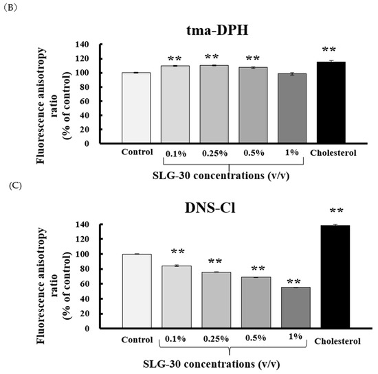 In this study, we examined and elucidated the absorption-enhancing mechanisms of SLG-30 in improving the enteric absorption of poorly absorbed substances. Of all the absorption-enhancing mechanisms, an increase in the membrane fluidity is one of the most important mechanisms of action of many absorption enhancers. Labeling the cell membrane with fluorescent compounds allows the tracking of membrane fluidity changes by fluorescence polarization techniques [25,28]. Enteric BBMVs were used to study the membrane lipid fluidity in the presence of SLG-30. This was done by measuring the fluorescence intensities and calculating the fluorescence anisotropies of DPH, tma-DPH, and DNS-Cl [37,38]. As shown in Figure 3A, SLG-30 slightly decreased the anisotropy of DPH; meanwhile, it decreased the anisotropy of DNS-Cl in a dose-dependent pattern, as shown in Figure 3C. These results suggested that SLG-30 has a great effect on the protein portion of the cell membrane with a mild effect on the inner portion between the phospholipids bilayers. However, it did not have an effect on the outer portion of the phospholipid bilayers, as indicated in Figure 3B.
