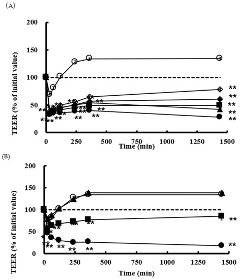 The TEER values in the existence of (A) SLG-30 and (B) sodium glycocholate and sodium laurate in Caco-2 cell monolayers. The results are expressed as the mean ± S.E. (n = 3). ** p < 0.01, n.s. not significantly different when compared with the control. Keys for Figure 4A: (◯) Control, (◇) 0.001% (v/v) SLG-30, (◆) 0.01% (v/v) SLG-30, (■) 0.025% (v/v) SLG-30, (▲) 0.05% (v/v) SLG-30, and (●) 0.1% (v/v) SLG-30. Keys for Figure 4B: (◯) Control, (▲) 0.1% (w/v) sodium glycocholate, (■) 1% (w/v) sodium glycocholate, and (●) 0.05% (w/v) sodium laurate.