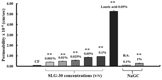 The permeability of CF in the presence of SLG-30, sodium glycocholate, and sodium laurate across Caco-2 cell monolayers: The results are expressed as the mean ± S.E. (n = 3). ** p < 0.01, n.s. not significantly different when compared with the control.