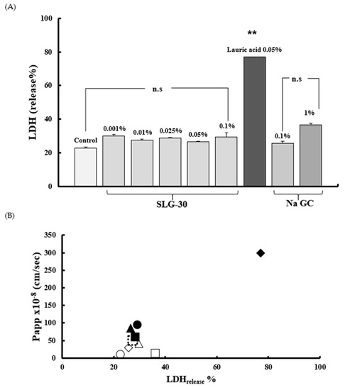 (A) The evaluation of the membrane toxicity of Caco-2 cells monolayers in the existence of SLG-30, sodium glycocholate, and sodium laurate and (B) the relationship between the effects of SLG-30 and typical absorption enhancers on the CF permeability across Caco-2 cells and their toxic effects: The results are expressed as the mean ± S.E. (n = 6). ** p < 0.01, n.s. not significantly different when compared with the control. Keys for Figure 6B: (◯) Control, (∆) 0.001% (v/v) SLG-30, (