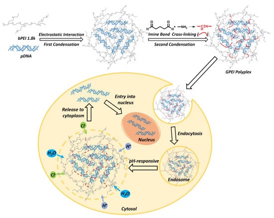 Thus, our group designed an integrative plasmid DNA (pDNA) delivery system with glutaraldehydelinked-branched PEI (GPEI) polyplexes (Figure 1) []. Glutaraldehyde (GA) was utilized as cross-linking agent to crosslink low-molecular-weight PEI (PEI 1.8 kDa). A one-pot construction was used to simultaneously achieve the integration of vector synthesis and polyplex preparation in a simple step. We mixed VEGF pDNA, PEI 1.8 kDa, and GA solution together in the aqueous environment. Throughout this robust system, PEI 1.8 kDa could easily and efficiently condense pDNA via electrostatic interaction to form polyplexes. Then, the aldehyde groups in GA could further react with the amine groups of PEI 1.8 kDa to form imine linkages, which could condense the pDNA again in theory. Ideally, the electrostatic interaction between PEI and pDNA and the chemical bonding between PEI and GA could finally come into an interpenetrating network, resulting in high stability and dense structure. Our experimental results showed that polyplexes prepared by this twice-condensation method showed smaller particle sizes and higher transfection efficiency. The stability of polyplexes system was enhanced, which could effectively reduce nucleic acid leakage. Besides, the preparation of GPEI polyplexes described here was quite simple, robust, and practicable. It avoided time-consuming chemical synthesis and purification as well as the use of organic solvents in the biomaterial system, resulting in time savings and desired biocompatibility.