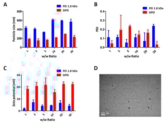 Physiochemical properties of the GPEI polyplexes. (A) Particle sizes, (B) polydispersity index (PDI), and (C) zeta potential of the GPEI and PEI 1.8 kDa polyplexes. (D) TEM images of the GPEI polyplexes (w/w ratio = 5). Bars = 200 nm.