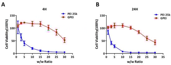 Cell viability of human umbilical vein endothelial cells (HUVECs) treated with the GPEI and PEI 25 kDa polyplexes. (A) Cell viability of HUVECs for 4 h. (B) Cell viability of HUVECs for 24 h. Data are shown as mean ± S.D. (n = 6).