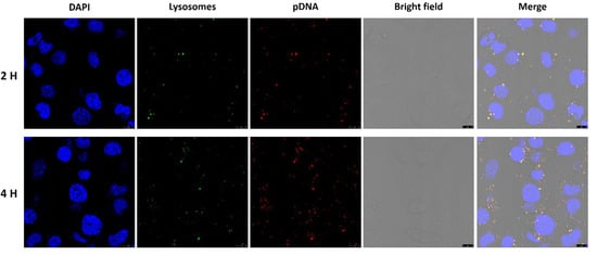 In order to have a direct observation of the intracellular uptake of GPEI polyplexes, the intracellular localization of GPEI polyplexes in HUVECs was measured by a Super-Resolution Multiphoton Confocal Microscope (SMCM) (TCS SP8 STED 3X, Lecia, Germany) []. GPEI polyplex solutions (w/w ratio = 5, 10) were prepared as regular methods and the pDNA was labeled with the fluorophore Cy3 (GenePharma, Shanghai, China). HUVECs were seeded into 12-well plates (5 × 105 cells/well) with cell slides (WHB Scientific, Shanghai, China) and cultured for about 24 h. Then, the medium was replaced by 1 mL new culture medium (without FBS) and 200 μL GPEI polyplex solutions. After 2 h, cells were washed five times with phosphate buffer saline (PBS) and 2 mL LysoTracker Green (100 nM) (Beyotime, Shanghai, China) were added to mark the lysosome for 50 min at 37 °C. Next, cells were washed five times with PBS and 1 mL trypan blue solution (0.4%) (Yeasen Biotech, Shanghai, China) was added to mark viable cells for 2 min at room temperature. Then, cells were washed five times with PBS and 1 mL 4% paraformaldehyde was added to fix cells for 30 min at room temperature. Finally, cells were washed five times with PBS and 2 mL DAPI (1 μg/mL) (Roche Diagnostics, Mannheim, Germany) was added to mark the cell nucleus for 4 min at 37 °C and investigated by SMCM. Similarly, the 4-h intracellular uptake was conducted by the same method.