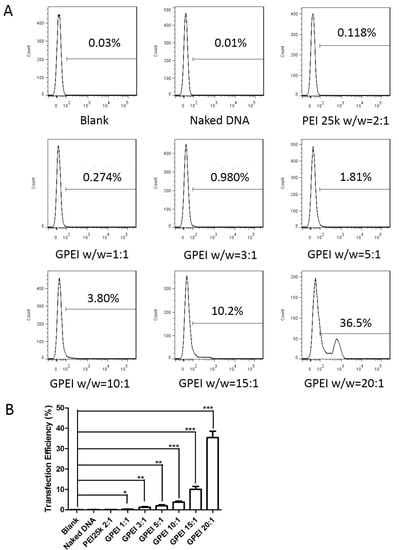 In vitro cell transfection efficiency of the GPEI polyplexes for HUVECs. (A) The transfection efficiency analyzed by software FlowJo. (B) In vitro transfection efficiency (data are presented as mean values ± S.D. (n = 3, *: p < 0.05 **: p < 0.01 ***: p < 0.001).