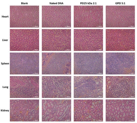 In vivo cytotoxicity of GPEI polyplexes was evaluated by hematoxylin–eosin (HE) staining. When rats were sacrificed, the main organs (including heart, liver, spleen, lungs and kidneys) of rats were immediately harvested and fixed in 4% paraformaldehyde, sectioned, and stained with HE. After staining, the glass slides were observed under optical microscope.