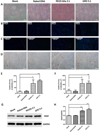 CD34 immunofluorescence staining and CD31 immunohistochemical staining were used for morphological observation to evaluate neovascularization in gastrocnemii. In Figure 8C, although some CD34 signals could be detected in the blank group and naked VEGF group, almost no intact vascular morphology was observed in gastrocnemii. In contrast, a greater number of areas of neovascularization were clearly observed in the PEI25 kDa 2:1 group and the GPEI 5:1 group. And results in Figure 8D also showed that the PEI25 kDa 2:1 group and GPEI 5:1 group showed more newborn capillaries. The capillary density of gastrocnemii was then analyzed semi-quantitatively (Figure 8E,F). The result was consistent with the morphological observation and confirmed our expectation that the gene therapy of VEGF could promote capillary angiogenesis.