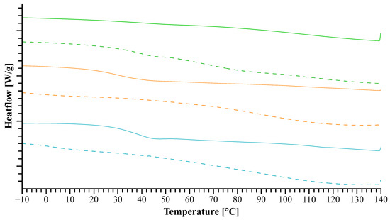 The solid lines represent the differential scanning calorimetry (DSC) thermograms of the extrudates and the dotted lines represent the evaporates which were used for the later extrusion. The amino acids added to sodium carboxymethylcellulose (NaCMC) are arginine (cyan), lysine (orange), and histidine (green).