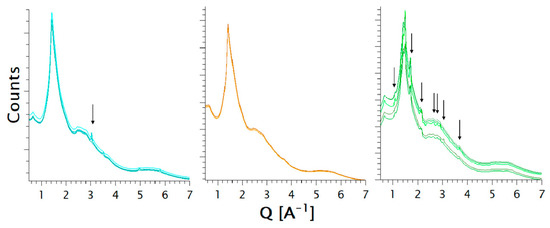 X-ray synchrotron results (i.e., arbitrary counts versus Q vector, Q = 4πsin(θ)/λ) are displayed from the extrudates with amino acid coformers. The amino acids added to NaCMC are from left to right: arginine (cyan), lysine (orange), and histidine (green). Each diffraction pattern corresponds to a measured area in the extrudate.