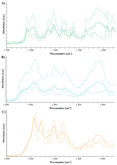 Fourier transform infrared spectroscopy (FTIR) spectrograms of NaCMC and histidine (A, green), arginine (B, cyan) and lysine (C, orange). Dotted lines represent the physical mixture, dashed lines represent the solvent evaporates and the extrudates are shown in solid lines.