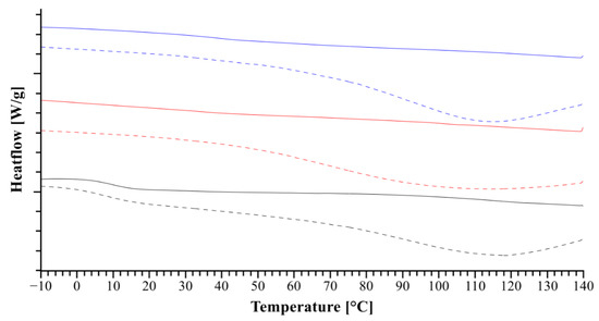 The solid lines represent the thermograms of the extrudate and the dotted lines represent the evaporates, which were used for the later extrusion. The additives used in addition to NaCMC are meglumine (black), TRIS (red) and urea (blue).