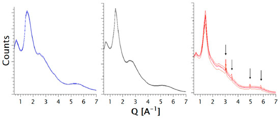 All samples were measured at five different areas. However, differences in the patterns can be seen only for the case where TRIS was used as the additive, particularly for differences in scattered intensity and the emergence of Bragg peaks at Q values of 3.03 A−1, 3.50 A−1, 4.95 A−1 and 5.81 A−1. By contrast, the patterns of the extrudates containing meglumine and urea present no observable differences in their X-ray synchrotron results (Figure 7). The absence of Bragg peaks in the patterns collected on samples containing meglumine and urea prove that the obtained polymer matrices were fully amorphous at the molar fractions of 0.57 and 0.52, respectively. The PXRD patterns, collected on the sample containing TRIS at the synchrotron source, showed indications of crystallinity, which were not detectable in the patterns of the laboratory diffractometer. Such crystallinity could be a sign of recrystallization after the extrusion as well as residual crystallinity. Both sources of crystallinity are related to the instability of an amorphous form [38].