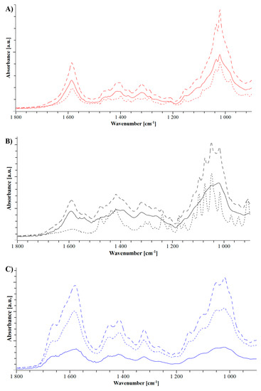 FTIR spectrograms of NaCMC and TRIS (A, red), meglumine (B, black), and urea (C, blue). Dotted lines represent the physical mixture, dashed lines represent the solvent evaporates and the extrudates are shown in solid lines.