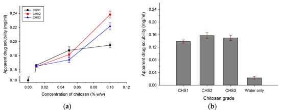 Figure 2 presents the ‘apparent’ solubility of piroxicam in water at both acidic pH 1.2 and deionized water (pH 5.6) measured in the presence of different CHS viscosity grades. In Figure 2a, the ‘apparent’ solubility of PXC at pH 1.2 (where CHS dissolves) was plotted against CHS concentration while the bars in Figure 2b show ‘apparent’ solubility at pH 5.6 in the presence of suspended CHS. Due to its primarily acidic character, PXC is more soluble in basic environments [35,36]. Its measured greater solubility in CHS-free water at pH 1.2 than at pH 5.6 (0.10, Figure 2a, compared with 0.023 mg/mL, Figure 2a,b) is attributed to its amphiphilic character that allows some ionization at pH 1.2 (protonation of -NH2) but not at pH 5.6. From Figure 2a, it can be seen that, at pH 1.2, the ‘apparent’ solubility increased remarkably from 0.10 mg/mL in CHS-free water to 0.165 mg/mL in the 0.01 w/w CHS solution. Thereafter, the increase differed for each grade. For the low viscosity CHS1, it was small and reached 0.194 mg/mL at the highest 0.1% w/w CHS while, for the medium CHS2 and high CHS3 viscosity grades, it increased exponentially. It reached 0.238 and 0.222 mg/mL. Similarly, Figure 2b shows that the presence of CHS as suspended polymer in deionized water also increased drug solubility, but, to a lesser extent than pH 1.2, and the differences between the drug solubilities in the three CHS suspensions were small (0.138, 0.157, and 0.150 mg/mL for CHS1, CHS2, and CHS3, respectively).