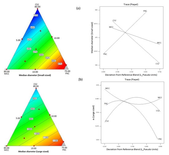 Statistically significant model equations with fitting indices derived from the analysis of the experimental design that describe the effects of composition on the pellet diameter, the shape, and flowability for the mini and conventional pellets are presented in Table 5. In all cases there was no lack of fit. Respective contour and trace plots are presented in Figure 3, Figure 4 and Figure 5. The plots in Figure 3 show that increasing CHS2 decreased the mean pellet diameter for both mini and conventional pellets while PXC caused a diameter increase and MCC had a minimal effect. The model equations were linear (R2 0.837 and 0.742 for mini and conventional pellets respectively). The decrease observed at high CHS2 content is associated with high wetting liquid consumption followed by shrinkage during drying. The increase of the pellet diameter at high PXC is due to the irregular, elongated pellet shape (Figure 1b).