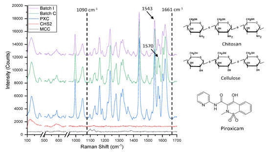 Raman spectra provide information regarding interactions of drugs with excipients. In Figure 6, the spectra of chitosan (CHS2), microcrystalline cellulose (MCC), piroxicam (PXC), and batches C, l with 37.5% drug and low or high CHS/MCC ratio (10/47.5 and 47.5/10), respectively, are presented. The CHS2 spectrum showed two small peaks at 119 cm−1 and 583 cm−1. The MCC spectrum showed one small double peak at 1196/1120 cm−1. The PXC spectrum showed a large fingerprint region in the range of 1090 to 1661 cm−1 (enclosed by vertical dotted lines), which is due to the complex patterns of C–C, C–N, and aromatic ring vibrations [52]. The drug peaks at 1543 and 1570 cm−1 are due to ring stretching and C=C symmetric stitching vibrations, respectively (indicated by arrows), are present in both C, I spectra and are characteristic of form II [53]. The spectra of both C and I showed the same peaks in the fingerprint region as the drug spectrum, which indicates no polymorphic transformation or interaction due to processing. Furthermore, peaks at 1007 and 1401 cm−1 that are characteristic of the PXC monohydrate [35,53] are not seen in the spectra of drug or pellet batches, which indicates an absence of the monohydrate drug.