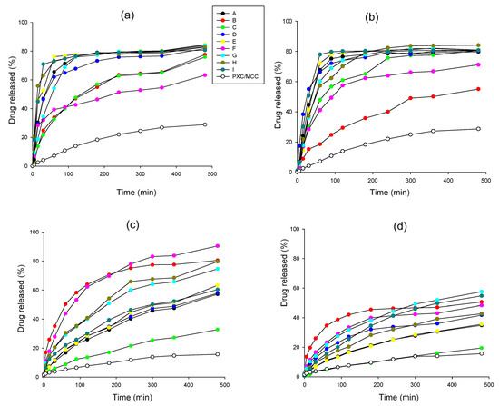 From Figure 8c,d, it can be seen that, at pH 5.6, the profiles of the mini pellets differed greatly from the conventional pellet profiles with the latter displaying much slower release (<50% after 8 h), which precludes practical use. From the values of the similarity factors f2 in Table 7, it appears that only batches A, C, D, and I showed similarity between mini and conventional pellets (f2 > 50). These batches all had high PXC content (37.5% or 70%) and exhibited erosion after dissolution testing (Figure 10), which alters the diffusional release. Figure 8c shows that the release curves of the mini pellets fall into three groups where: one group has a faster release (over 80% in 8 h) and comprises batches B and F, with high CSH2/PXC ratios of 16.0 and 9.0, respectively; a second group comprises batches G and H with CSH2/PXC ratios of 2.0 and 2.5 and releases 70–80% after 8 h; a the third group comprises batches A, D, E, and I with CSH2/PXC ratios of 0.91, 0.21, 1.25, and 1.27, respectively, showing low release between 50% and 60%. Batch C that had a CSH2/PXC ratio of 0.27, showed poor release. The latter five batches with reduced or poor release exhibited erosion and loss of matrix integrity after testing (Figure 10), which altered the beneficial release effect. On the other hand, batches B, F, G, and H of mini pellets, which did not disintegrate, showed good extended release over 8 h. Of these, batches B, F, and G also gave extended release at pH 1.2 and, therefore, appear to be promising extended-release formulations.
