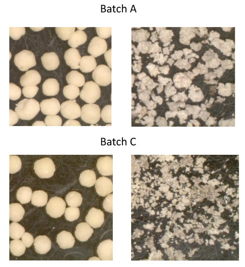 In Figure 8, release profiles of mini and conventional pellets at two pH media (pH 1.2 and 5.6) are presented together with data from MCC/PXC pellets without chitosan for comparison purposes. Although the stay of the drug in the stomach delivered by conventional formulations is usually less than 120 min., this time may increase considerably for the present pellet formulations due to the muco-adhesive properties of chitosan [56]. For this reason, release studies of up to 500 min were conducted since the release exceeded this period for some pellet batches. Representative images of pellets before and after dissolution at pH 1.2 are shown in Figure 9 for batches A and C. Figure 10 presents images of all experimental batches before and after dissolution in deionized water (pH 5.6). The dissolution efficiency (DE%) and similarity factors (f2) comparing drug release from mini and conventional sized pellets at pH 1.2 and pH 5.6 are given in Table 7.