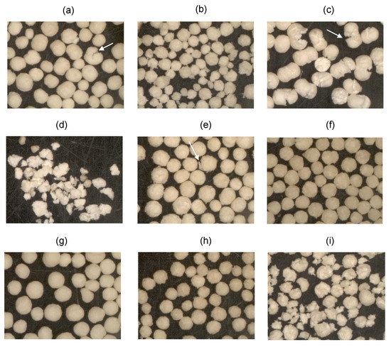 Pellet size and shape were determined using an image processing and analysis system, as previously described [41]. Mean pellet diameter was expressed as an equivalent circle diameter and shape as the index eR (Equation (1)), which is sensitive to surface irregularity and pellet geometry, and its value increases with sphericity, which nearly reaches 0.75 for perfect spheres [42]. Examples of pellet shapes with corresponding eR values are shown in Figure 1.