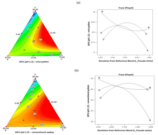Contour and trace plots of dissolution efficiency for (a) mini and (b) conventional pellets at pH 5.6.